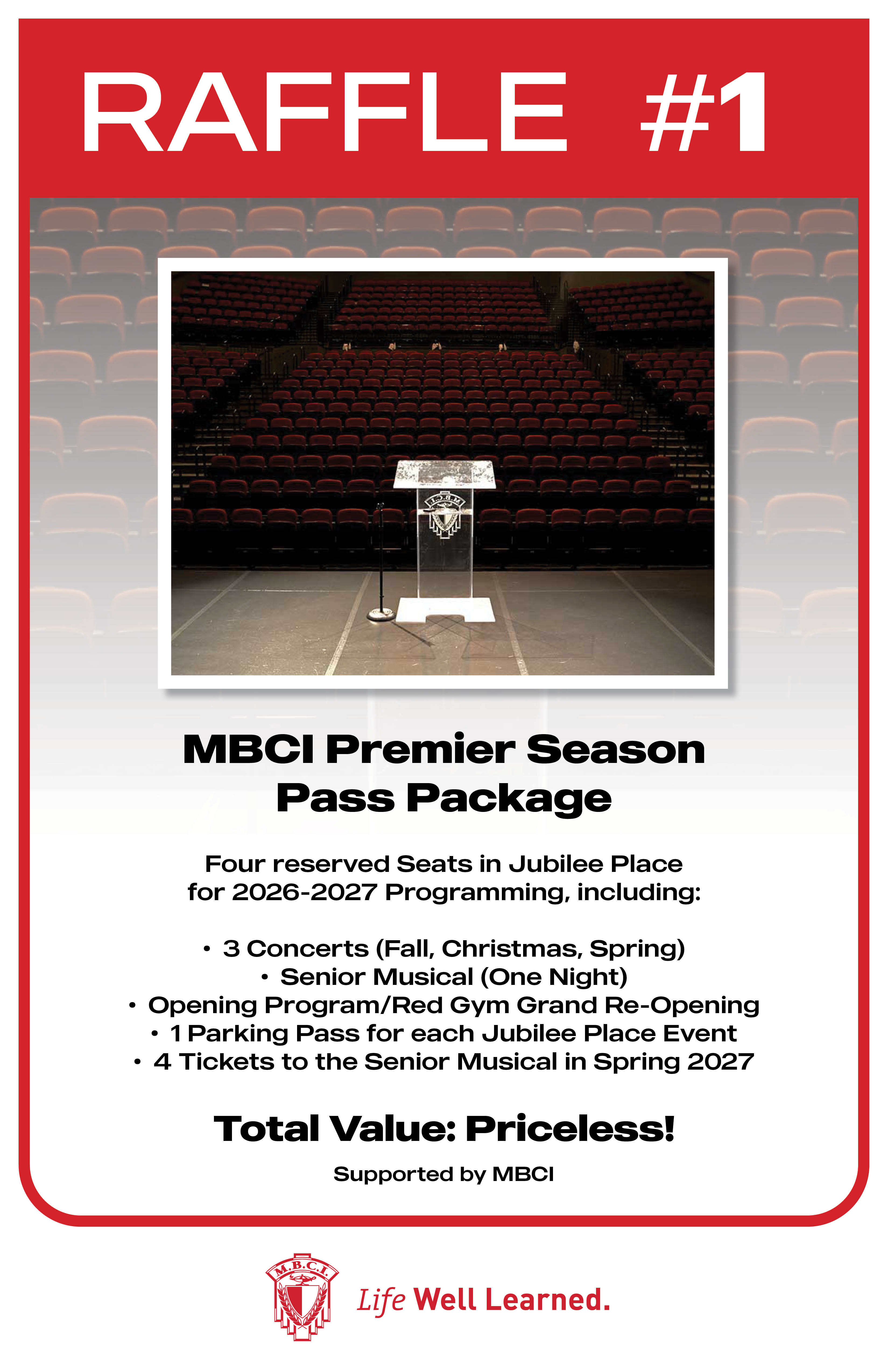 - MBCI Premier Season Pass Package - Four reserved seats in Jubilee Place for 2026-2027 Programming, including three concerts (Fall, Christmas, Spring), Senior Musical (one night), Opening Program/Red Gym Grand Re-Opening; one parking pass for each Jubilee Place Event; and four Tickets to the Senior Musical in Spring 2027. - Total Value: Priceless!! Supported By: MBCI.