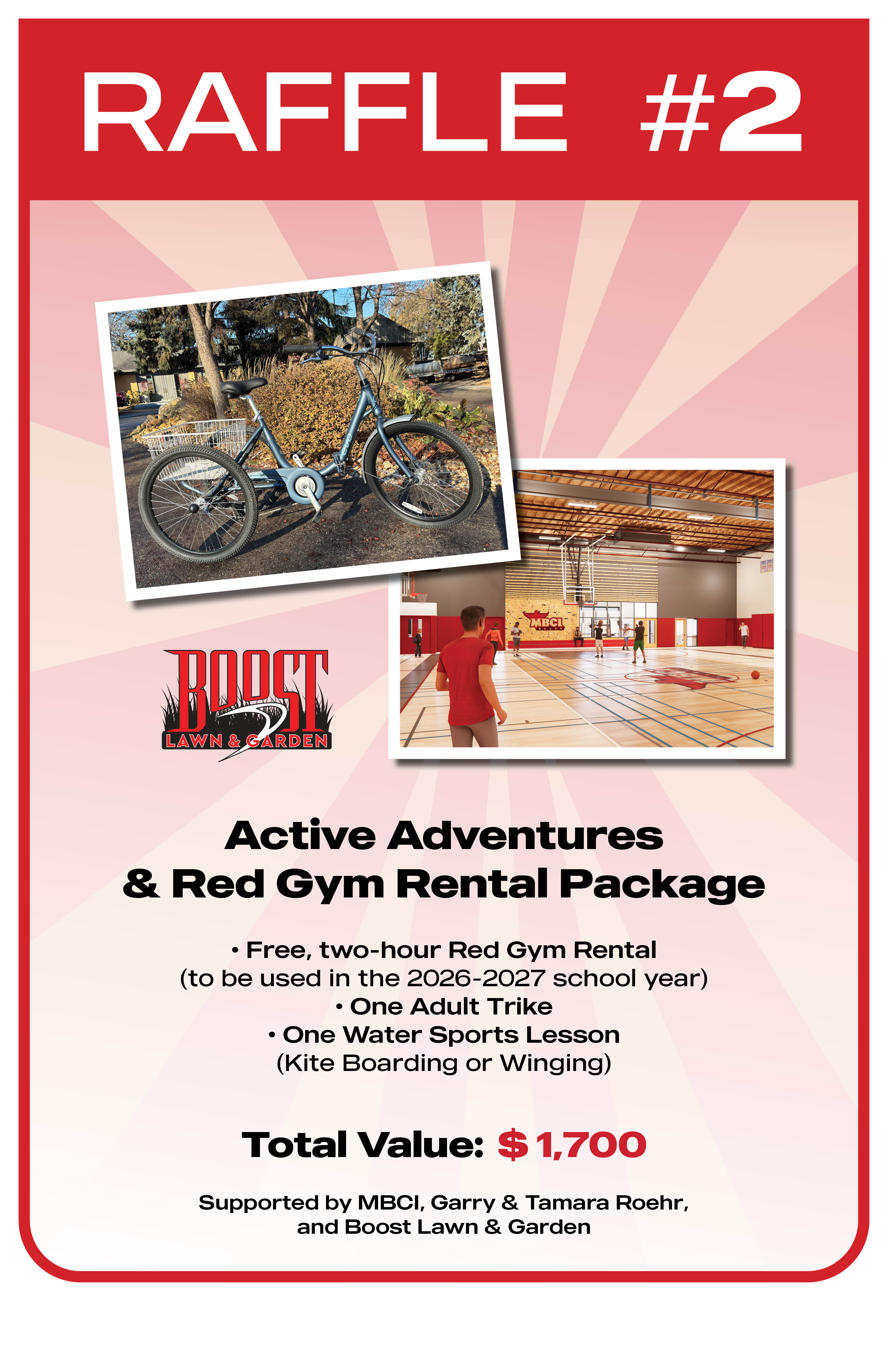 - Active Adventures & Red Gym Rental Package - Free, two-hour Red Gym Rental (to be used in the 2026-2027 school year); one Adult Trike; and one Water Sports Lesson (Kite Boarding or Winging) - Total Value: $ 1,700. Supported By: MBCI, Garry and Tamara Roehr, and Boost Lawn and Garden.