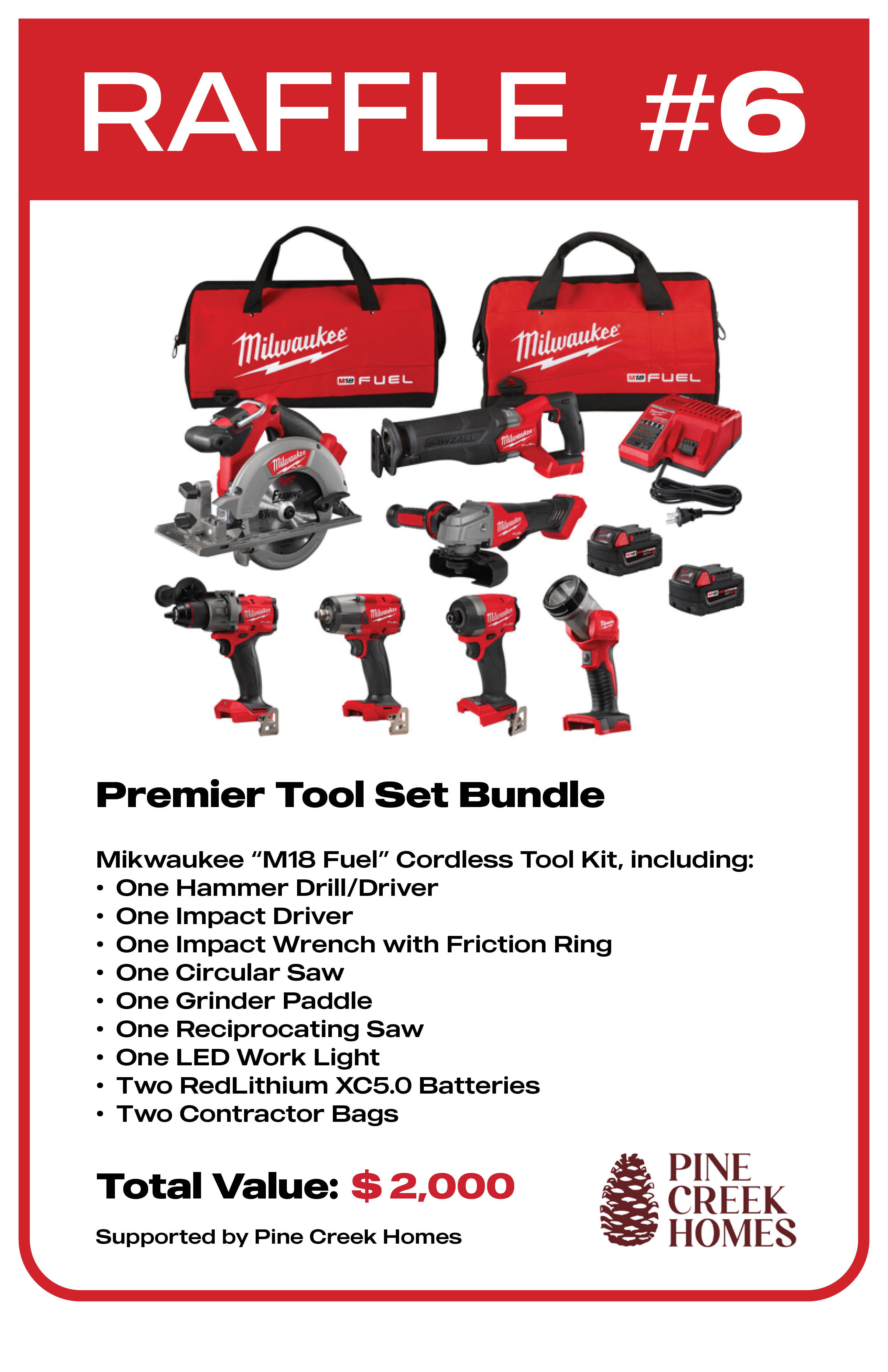 - Premier Tool Set Bundle - Mikwaukee "M18 Fuel" Cordless Tool Kit, including: One Hammer Drill/Driver; One Impact Driver; One Impact Wrench with Friction Ring; One Circular Saw; One Grinder Paddle; One Reciprocating Saw; One LED Work Light; Two RedLithium XC5.0 Batteries; and Two Contractor Bags - Total Value: $ 2,000. Supported By: Pine Creek Homes.