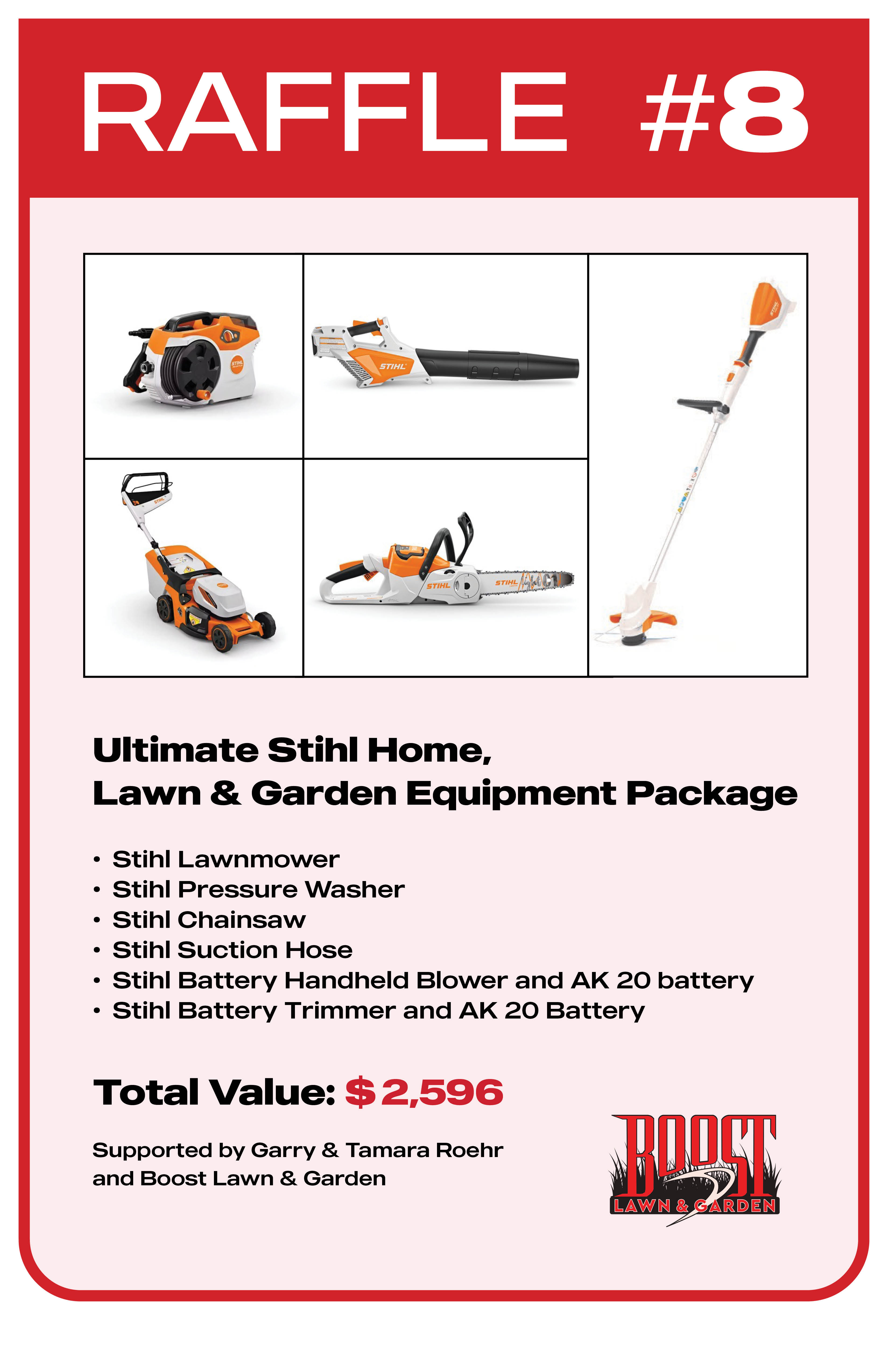 - Ultimate Stihl Home, Lawn, and Garden Equipment Package - Stihl Lawnmower, Stihl Pressure Washer; Stihl Chainsaw; Stihl Suction Hose; Stihl Battery Handheld Blower and AK 20 battery; Stihl Battery Trimmer and AK 20 Battery - Total Value: $ 2,596. Supported By: Garry and Tamara Roehr and Boost Lawn and Garden.