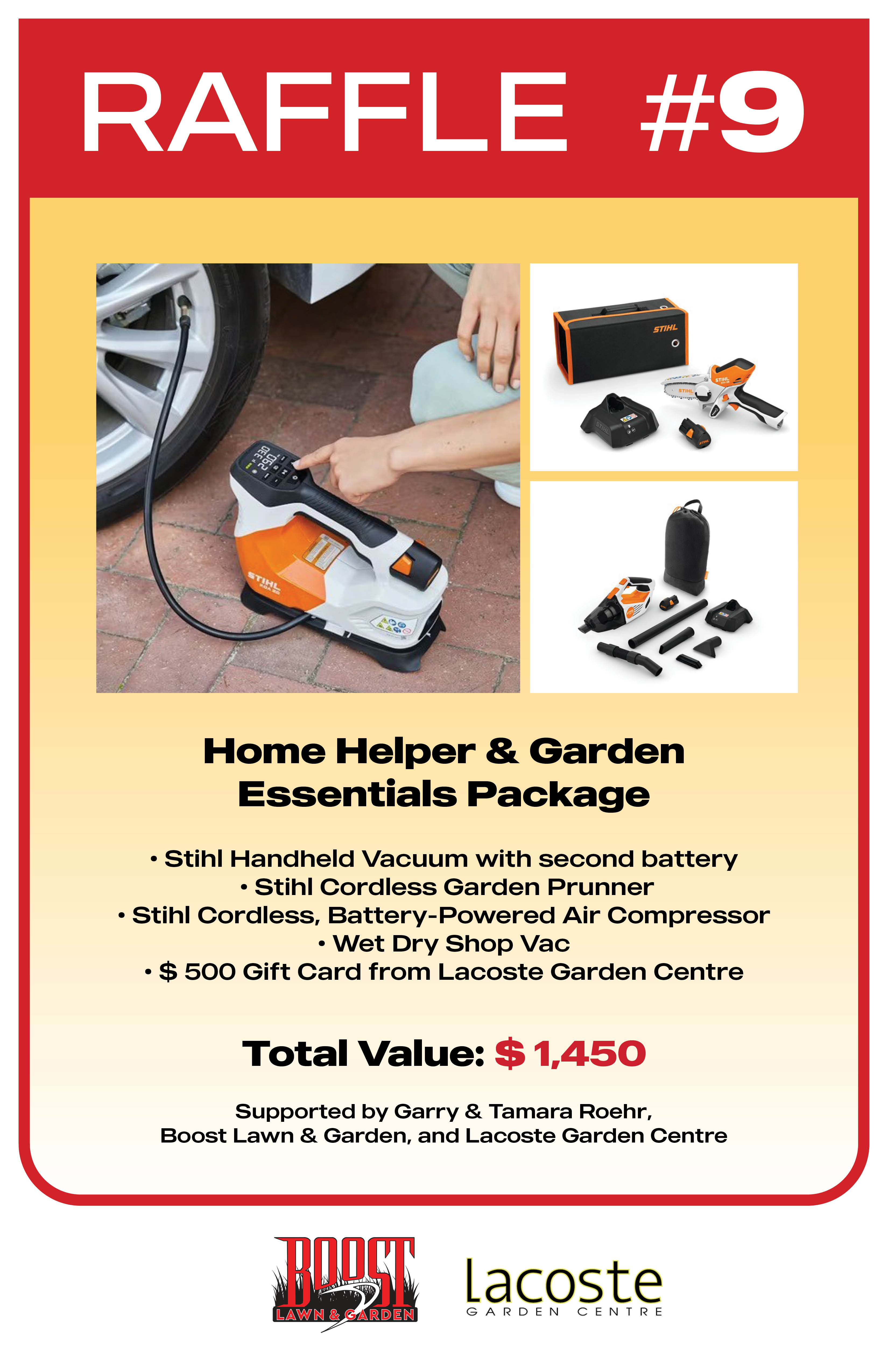 - Home Helper & Garden Essentials Package - Stihl Handheld Vacuum with second battery; Stihl Cordless Garden Prunner; Stihl Cordless, Battery-Powered Air Compressor; Wet Dry Shop Vac; and a $500 Gift Card from Lacoste Garden Centre - Total Value: $ 1,450. Supported By: Garry and Tamara Roehr, Boost Lawn and Garden, and Lacoste Garden Centre.